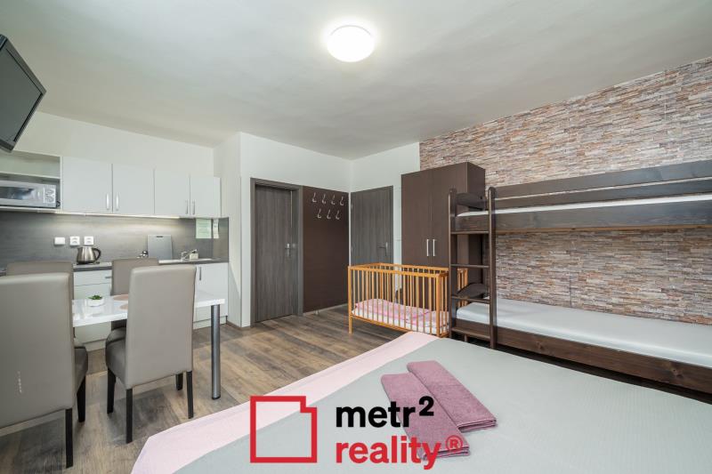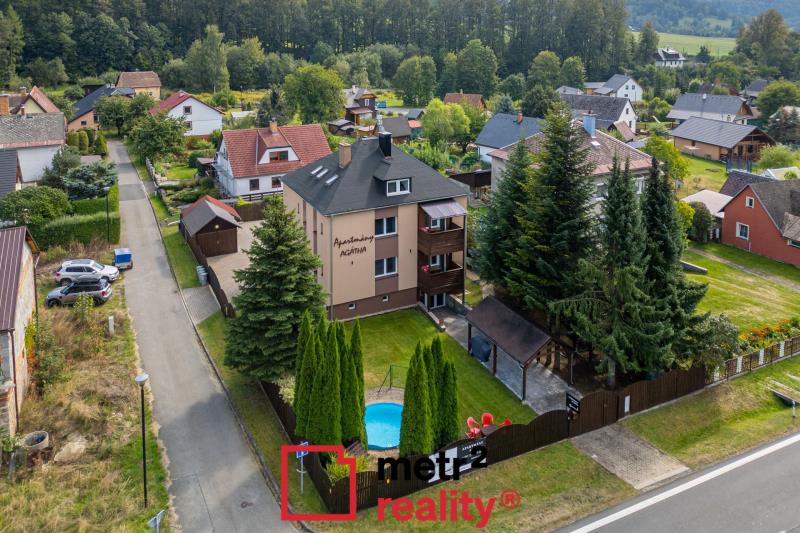 Vážení klienti, Rádi bychom vám ve výhradním zastoupení sympatických majitelů nabídli možnost koupě zajímavé nemovitosti v podobě apartmánového domu v malebné horské lokalitě Loučná nad Desnou, místní část Rejhotice. V katastru nemovitostí je nemovitost vedena jakožto rodinný dům s pozemkem o celkové výměře 917 m2 včetně zastavěné plochy a nádvoří. Především díky níže uvedeným velkorysým parametrům by předmětná nemovitost neměla rozhodně uniknout vaší pozornosti: - Lukrativní poloha v krásné přírodě v těsné blízkosti atraktivních lyžařských areálů, především Koutů nad Desnou a Přemyslovic - Vynikající technický stav třípodlažní nemovitosti po celkové rekonstrukci z roku 2021 - Sedm samostatných pěkných apartmánů s celkovou kapacitou 32 osob s dostatečným počtem zabezpečených parkovacích míst pro devět osobních vozidel + garáž s dílnou - Nadstandardní technické a sociální zázemí se soukromou wellness zónou a prostornou společenskou místností s posezením, dětským koutem a venkovním bazénem - Úsporné obslužné technologie garantující velice nízké měsíční náklady (tepelné čerpadlo, kvalitní zateplení, plastová okna trojskla) - Rentabilní celoroční obsazenost objektu zaručující stabilní ziskovost - A mnoho dalších přidaných hodnot Na nemovitosti neváznou žádná právní omezení. Veškeré doplňující informace vám rádi sdělíme na vyžádání.