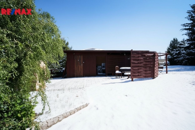 Dále na pozemcích krytá garáž a skladovací montovaná stavba, vhodné jako zázemí pro údržbu, případně uložení jízdních kol, resp. jiného sportovního náčiní.