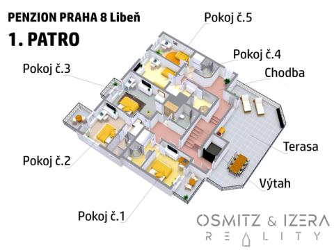 • Nadzemní podlaží: 12 pokojů + 1 apartmán, každý s vlastním sociálním zařízením, 5 pokojů s balkónem.