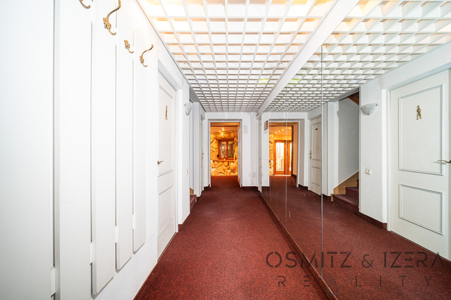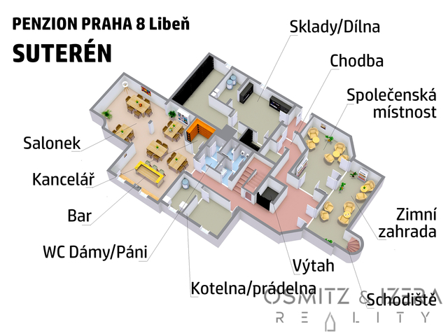 • Suterén: Společenská místnost s barem, salonek se zimní zahradou s přístupem na zahradu, kancelář, sociální zařízení, kotelna, strojovna výtahu, sklady. Suterén lze využívat jako zázemí pro dům, nelze oficiálně celé užívat jako pobytové místnosti.
