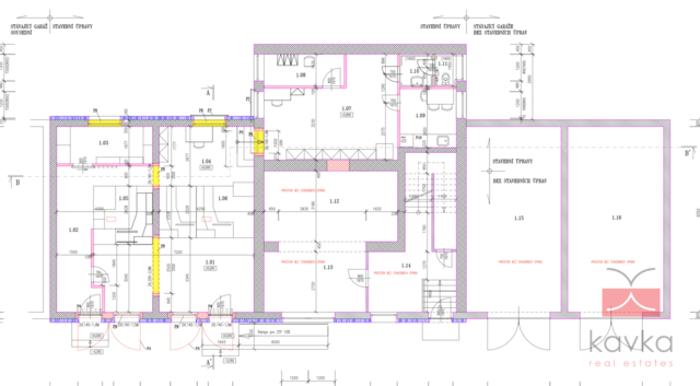 Dispoziční členění: 1.NP - (provoz č. 1) - hala, chobba-zázemí, balíkový sklad, zázemí přepážek, balíková přepážka, univerzální přepážky, zázemí, šatna, denní místnost, předsíň, WC, (provoz č. 2) - prostor prozatím bez využití, prostor prozatím bez využití, chodba a schodiště do 2.NP, (provoz č. 3) garáž, (provoz č. 4) garáž. Dispoziční členění: 2.NP - (provoz č. 5) – byt 2+1 – chodba, kuchyň, WC, koupelna, pokoj č. 1 pokoj č.2.
