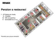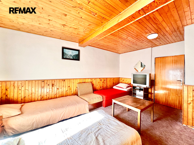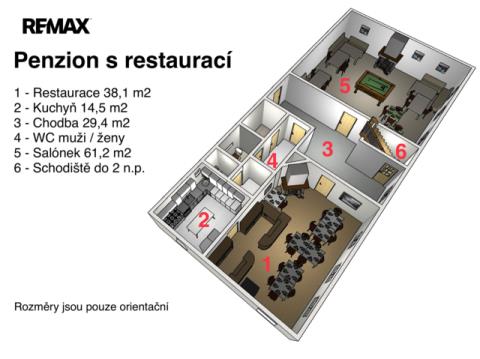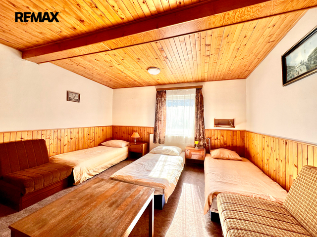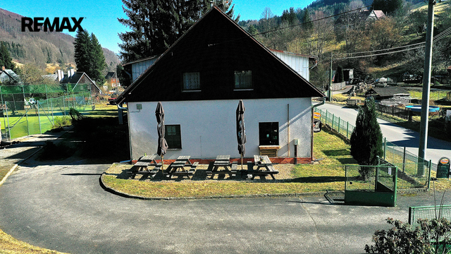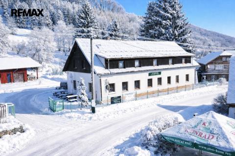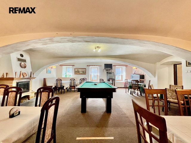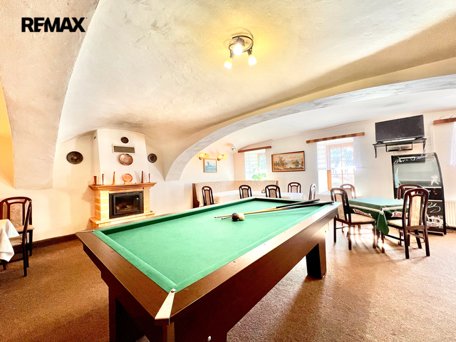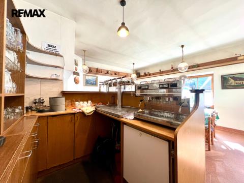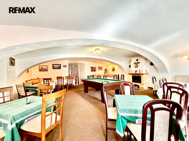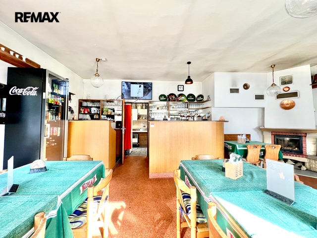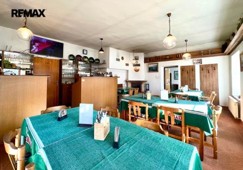 Restaurace s vybavenou kuchyní, 20 míst k sezení, bar, WC. Velký salonek 50 míst, krb, kulečník, šipky - možnost pořádání akcí, svatby, rodinné oslavy atd.