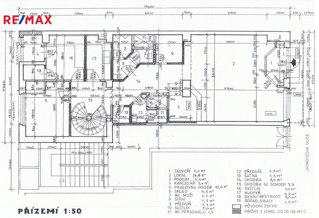 V 1. NP se nachází centrální část vhodná pro pro prodejnu, restauraci, pekařství, masnu, kavárnu, celkové posezení, recepci, přijímání klientů nebo zákazníků, na kterou navazuje chodba s příručními sklady, oddělenými WC a dvěma místnostmi s vanou a sprchovým koutem. Točitým dřevěným schodištěm se sejde do suterénu, kde jsou 2 místnosti a volný prostor 90 m2 vhodný ke cvičení, skladování (lze zajistit stálé klima), případně dalšímu posezení. V suterénu lze využít stávající rozvody studené a teplé vody, odpadů a centrálního vytápění, čímž lze zajistit sucho a celkově příznivé klima v celých spodních prostorech.