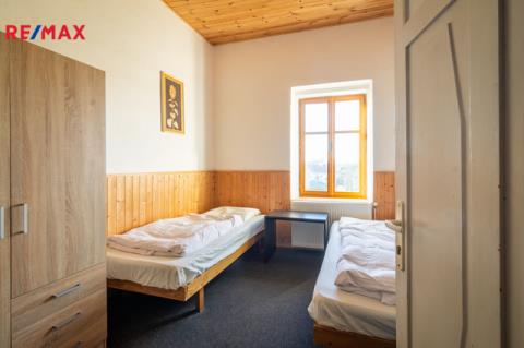 Druhé nadzemní podlaží je rozděleno na 2 části, v jedné je 8 pokojů pro ubytování hostů, venkovní terasa s pěkným výhledem do krajiny a společné sprchy a toalety na chodbě. Celková výměra části s ubytováním je 124 m² V druhé části patra je byt o dispozici 4+1, se dvěma koupelnami a zastřešenou terasou. Celková výměra bytu je 106 m² + 18 m² terasy.
