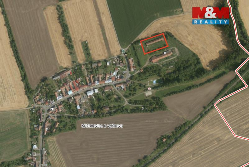 Prodej zemědělského objektu s pozemky – Křižanovice u Vyškova Nabízíme k prodeji bývalý zemědělský objekt s rozsáhlými pozemky v obci Křižanovice u Vyškova, okres Vyškov. Jedná se o soubor pozemků a stavbu bez čísla popisného/evidenčního. Dle katastru nemovitostí je evidováno: zastavěná plocha a nádvoří o výměře cca 702 m² (stavba bez čp/če), ostatní plocha o výměře cca 4 442 m². Celková výměra pozemků přesahuje 5 000 m². Stavba byla v minulosti využívána pro chov dobytka, v současnosti je delší dobu nevyužívaná. Pozemky jsou rovinaté a nabízejí široké možnosti dalšího využití. Dle územního plánu je nemovitost vedena jako plochy výroby a skladování a plochy smíšeně výrobní, což umožňuje podnikatelské využití, lehkou výrobu, skladování či kombinovanou činnost. Přípojky vody a elektřiny se nacházejí na hranici pozemku, napojení je možné řešit individuálně. Přístup k nemovitosti bude zajištěn věcným břemenem. Pro více informací nebo sjednání osobní prohlídky nás neváhejte kontaktovat.