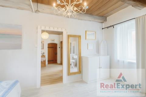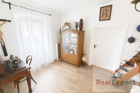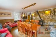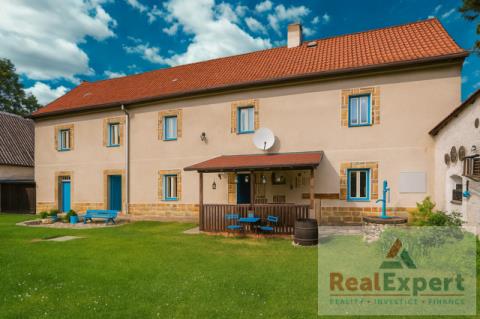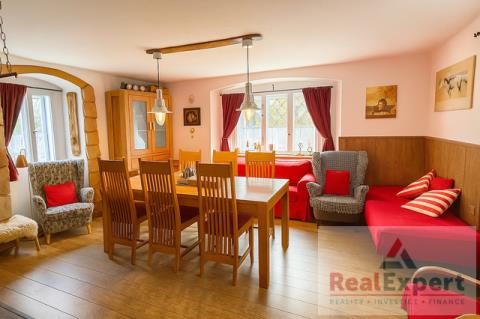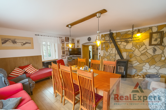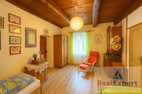 Dvoupodlažní dům o dispozičním řešení 5+1 (zastavěná plocha 19,5 x 6,8 m), s užitnou plochou cca 200 m² (+prostorná půda) a tradiční architekturou prošel v minulých letech citlivou rekonstrukcí, která zachovala původní ráz stavby. Najdete zde 4 prostorné pokoje (ložnice), stylový obývací prostor s jídelnou a krbovými kamny, vybavenou kuchyni, koupelnu a WC. Interiér spojuje přirozené materiály a moderní pohodlí – dřevěné podlahy, dekorativní trámy i výhled do zeleně. K dispozici je dále dílna, sklípek a garáž (6x3 m)