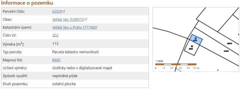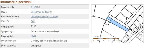 Prodej pozemků parcelní číslo: 610/10 a 620/9, katastrálního území: Veliká Ves u Prahy. Z orné půdy se změnou územního plánu stane stavební pozemek. Nový územní plán obce se do budoucna změní. Na pozemku je vlastní studna, elektřinu je možné zavést ze sousedních parcel.