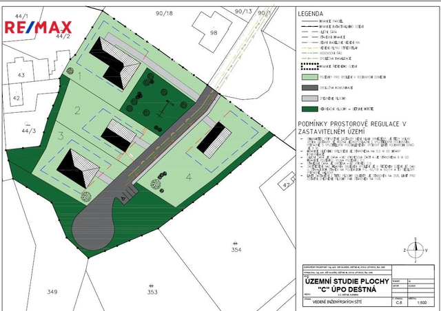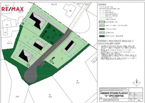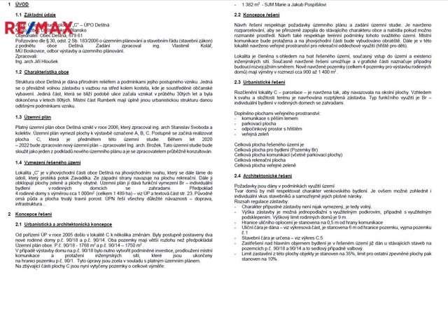 Celková plocha nabízeného souboru 2 pozemků je 6.002 m2, nyní jsou pozemky definované jako trvalý travní porost a jedná se o mírně svažité udržované travnaté plochy, které jsou volně přístupné z veřejné komunikace. Nabízené pozemky jsou v souladu s územním plánem obce součástí tzv. Plochy "C" (funkční vymezení Br), na kterou byla vypracována samostatná studie a na základě které zde územní plán umožňuje individuální bydlení v rodinných domcích se zahradami. Předpokládají se zde až 4 rodinné domy s výměrou cca 1 000 m2 na pozemcích s označením 1, 2, 3, 4. Na pozemku č.1 již započala stavba domu. Lokalita „C“ je v jihovýchodní části obce Deštná na mírném jihovýchodním svahu, který se dále láme do údolí, kudy protéká potok Zavadilka. Ze západní strany navazuje na plochu rekreační. Dále ji obklopují plochy zeleně na jihu a plochy obytné na severu. Jihovýchodní hranice pozemku je nově vytyčená.