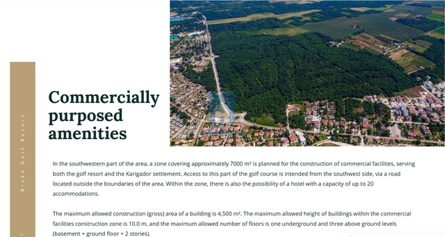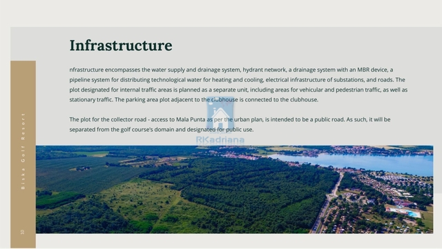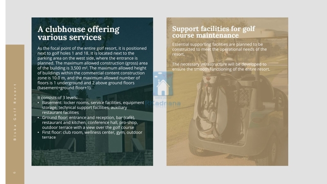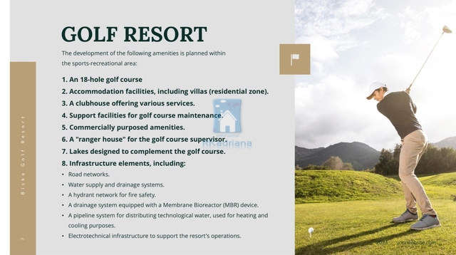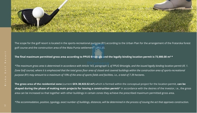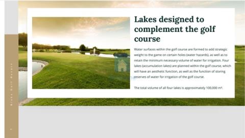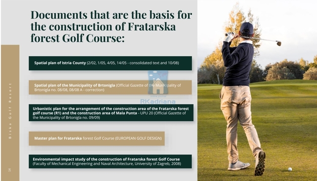 Obec Brtonigly B i s k a G o l f R e s o r t Developerský plán lesního golfového hřiště Fratarska je naplánován v místě v jednom z nejmalebnějších regionů obce Brtonigla • výhodná geodopravní poloha oblasti • vynikající konektivita především díky Istrijskému Y • rozmanitá škála krajin • zřetelné středomořské pobřežní charakteristiky • maximální nadmořská výška 35 metrů Fratarský les Golfové hřiště, které odpovídá nejnovější evropské a mezinárodní struktuře a ekologických norem, se plánuje v oblasti přibližně 74,5 hektarů. Bude mít celkovou délku 5860 metrů Samotné hřiště zabere při zachování cca 40 hektarů v přírodní krajině na přibližně 25 hektarech.