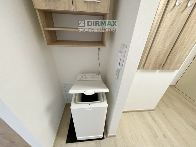 Při vstupu do bytu je skutečně velká předsíň, kde je volně stojící moderní skříň a samostatně stojící pračka. Je u věšák a další menší úložný prostor.