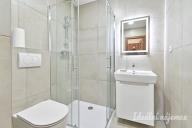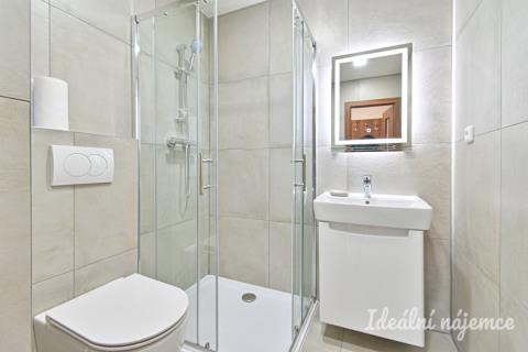 V koupelně se nachází sprchový kout, umyvadlo, zrcadlo a wc. V bytě jsou plovoucí podlahy.