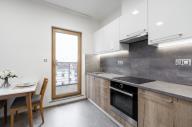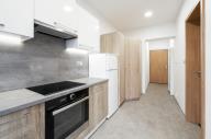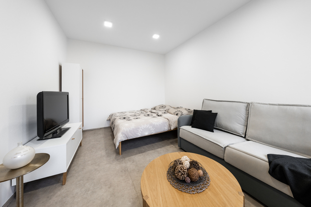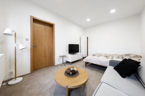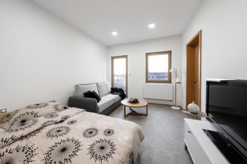 Dispozice zahrnuje pokoj, kuchyň, předsíň a koupelnu s toaletou. Součástí vybavení je kuchyňská linka včetně vestavné elektrické trouby, sklokeramické varné desky, digestoře, dále samostatně stojící lednice s mrazákem, jídelním stolem s židlemi, sedačkou, konferenčním stolkem, komodou, televizí, dvojlůžkem s matracemi, skříňkou s policemi, odkládacím stolkem, lampou a prostornou šatní skříní. Neschází ani úsporné LED osvětlení celého bytu, dvoudrážková kolejnice pro uchycení záclon a závěsů nad každým oknem, koupelnový nábytek či domácí videotelefon.