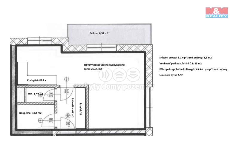 K pronájmu nabízíme moderní byt 1+kk (38 m²) v 1. patře novostavby z roku 2019 s výtahem. Byt tvoří prostorná hlavní místnost s kuchyňskou linkou vybavenou spotřebiči (myčka, trouba, mikrovlnka) a vstupem na balkon. Ve vstupní chodbě je skříň, koupelna a WC jsou oddělené. K bytu náleží sklep a venkovní parkovací stání. Možnost využití společné kolárny/kočárkárny v přízemí budovy. Nájemné činí 14 000 Kč + venkovní parkovací stání 1 000 Kč + služby 2 300 Kč, elektřina se převádí na nájemce. Kauce 30 000 Kč. Provize RK je 18 150 Kč. Byt je vhodný pro jednotlivce či pár, k nastěhování ihned. Pro více informací či domluvení prohlídky mě neváhejte kontaktovat.