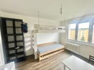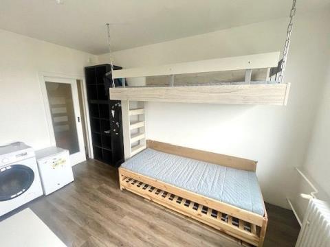 Vstupem do bytu se ocitnete v předsíni o ploše 2,15 m2 s vestavěnou skříní. Hned po pravé straně od vstupu do bytu se nachází prostorná koupelna o ploše 2,7 m2 se sprchový koutem, toaletou, umývadlem a prostorem na pračku. Naproti vstupu do bytu je umístěn obývací pokoj s kuchyňským koutem o ploše 14,5 m2, patrovou postelí, rozkládací postelí, policovou skřínkou, pračkou, lednici, televizi a pracovním koutem. Na podlaze předsíně a obývacího pokoje s kuchyňským koutem je položena vinylová podlaha, na podlaze koupelny s toaletou je keramická dlažba. Orientace bytu je na jihozápad, k bytu přináleží také sklep o ploše 2,13 m2 a k dispozici je rovněž využití balkonu v mezipatře.