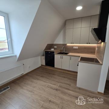 Nabízíme k pronájmu světlý byt v 3. nadzemním podlaží domu. Byt nabízí příjemné podkrovní bydlení s otevřeným prostorem a přiznanými dřevěnými trámy, díky čemuž působí velmi útulně a vzdušně. Dům prochází postupnou rekonstrukcí, první vchod je již dokončený a obsazený. Aktuálně probíhá rekonstrukce druhého vchodu, ve kterém se nachází i nabízený byt. Fotografie společných prostor jsou proto zatím ilustrační a odpovídají standardu již dokončeného vchodu. Součástí bytu je nová kuchyňská linka se spotřebiči, laminátové podlahy a koupelna se sprchovým koutem, umyvadlem a WC. Vytápění zajišťuje elektrický kotel se zásobníkem umístěný přímo v bytě, což umožňuje regulaci spotřeby podle vlastních potřeb. Dokončení rekonstrukce společných prostor je plánováno na konec léta. Do té doby je majitel připraven jednat o individuální slevě na nájemném. Nájemní podmínky: - nájemné: 9000 Kč / měsíc - služby: 1.140 Kč / měsíc - elektřina se přepisuje na nájemce (doporučená záloha cca 2.500 Kč) - jistota (kauce): 3× měsíční nájem - bez provize realitní kanceláře Byt je vhodný pro jednotlivce nebo pár, kteří hledají klidné bydlení v nově upraveném podkrovním bytě. V případě zájmu o prohlídku nás prosím kontaktujte zprávou nebo telefonicky. Majitel si vyhrazuje právo výběru nájemníka.