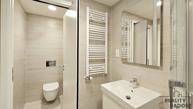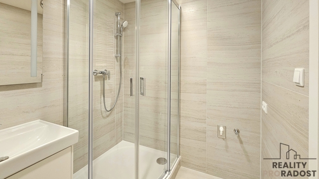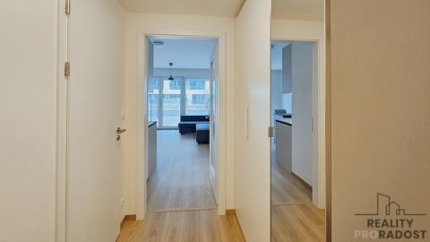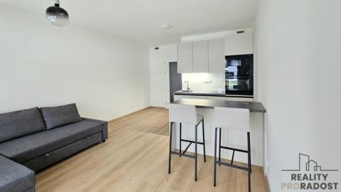 Dispozice bytu tvoří vstupní chodba vybavená šatní skříní, botníkem a věšákovou stěnou, koupelna se sprchovým koutem, samostatné WC a obývací pokoj s novou kuchyňskou linkou. Kuchyň je vybavena varnou deskou, elektrickou troubou, mikrovlnnou troubou, myčkou, lednicí a dřezem. Byt je proveden z kvalitních moderních materiálů a nabízí komfort nového bydlení.