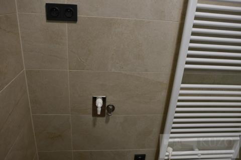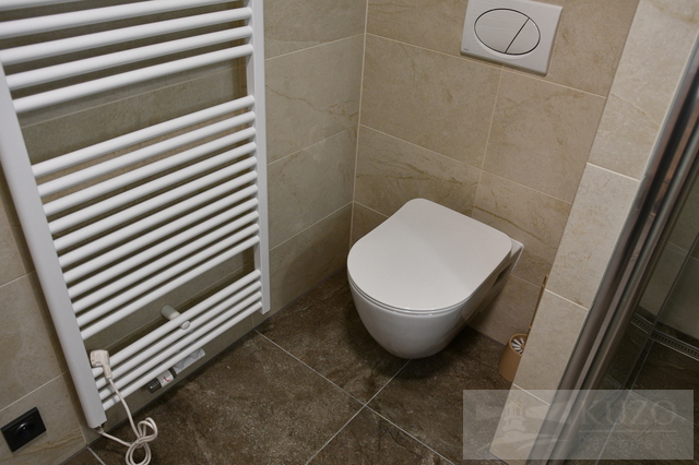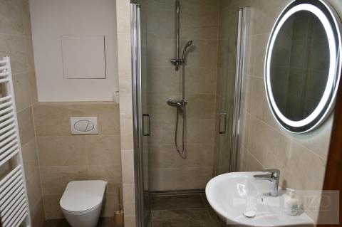 Koupelna je prostorná a vybavená sprchovým koutem, moderním prosvětleným, kruhovým zrcadlem. Příprava na pračku je samozřejmostí.