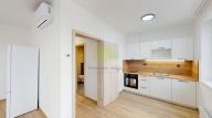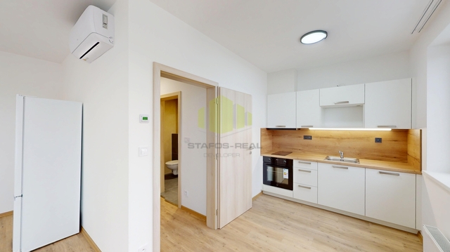 Kuchyňský kout je vybaven kuchyňskou linkou s indukční varnou deskou, elektrickou troubou, přípravou na myčku nádobí a samostatně stojící lednicí s mrazákem. V koupelně se nachází vana, umyvadlo, otopný žebřík a příprava pro pračku. Byt se pronajímá nevybavený, s výjimkou kuchyňské linky a spotřebičů.