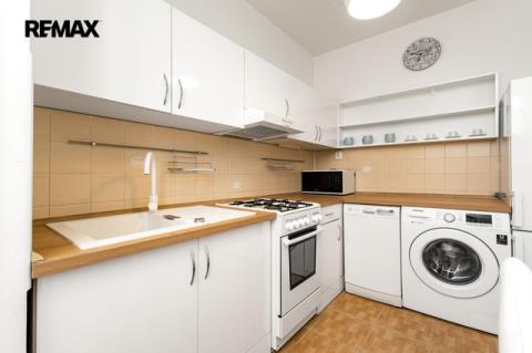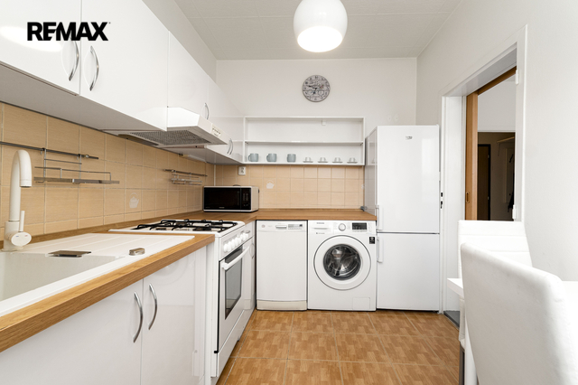 Kuchyňská linka je vybavena plynovým sporákem s troubou, digestoří, mikrovlnnou troubou, lednicí a k dispozici je také pračka. Dostatek pracovní plochy i úložného prostoru je samozřejmostí.