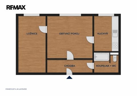 Dispozice bytu je praktická. Nabízí samostatnou kuchyň s jídelním prostorem, prostorný obývací pokoj, ložnici, koupelnu s vanou a toaletu. Nechybí ani chodba s úložnými prostory.