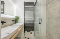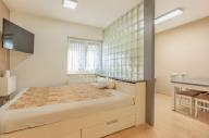 Vstupní chodba je vybavena vestavěnými skříněmi, které poskytují dostatek úložného prostoru. Koupelna disponuje sprchovým koutem, toaletou, dvěma umyvadly. Součástí vybavení je pračka i sušička. Kuchyňský kout s jídelní částí je řešen na míru a plně vybaven spotřebičemi – lednicí, sklokeramickou varnou deskou, troubou, mikrovlnnou troubou a kávovarem. Plynule navazuje na obytný prostor, který lze pomocí posuvných dveří oddělit a vytvořit tak samostatnou ložnici. Ložnice je dále oddělena designovou skleněnou příčkou z luxfer, která propouští denní světlo a zároveň zajišťuje maximální soukromí. Veškerý nábytek je vestavěný a navržen tak, aby byt bylo možné ihned plnohodnotně užívat bez nutnosti dalšího zařízení. Další pokoj, rovněž vybavený vestavěným nábytkem, je ideální jako dětský pokoj. K bytu náleží také zasklená lodžie o velikosti 4 m², která sloužila jako klidná pracovna. Na lodžii je instalována klimatizační jednotka, která v letních měsících byt příjemně ochladí a v zimě umožňuje přitápění, což výrazně zvyšuje komfort bydlení po celý rok.