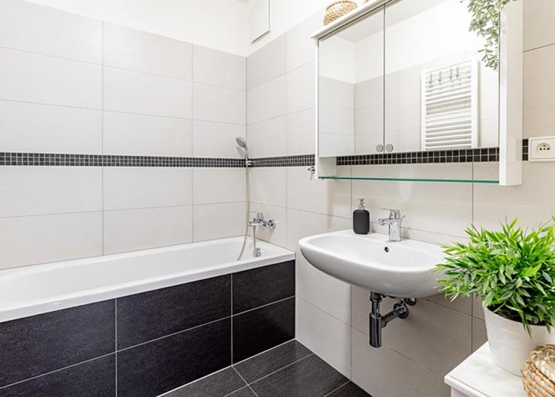 V předchodbě a v koupelně německá keramická dlažba, vana se sprchou, podlahové vytápění, přípojka na pračku.