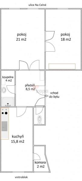 Exkluzivně nabízíme k pronájmu nezařízený byt 2+1 o velikosti 71m2 ve 2. patře cihlového domu bez výtahu, na Praze 5 - Smíchov, v ulici Na Celné 5min od metra Anděl. Byt je vymalovaný, světlý, vzdušný a velmi prostorný s okny do klidné ulice a vnitrobloku. Byt má vysoké stropy 3,35 m. Byt je nezařízený, je vybaven kuch. linkou s plynovým sporákem ( s el. troubou) a jídelním stolem se židlemi (možné odstěhovat). Ostatní nábytek a vybavení v kuchyni dle fotek (postel , mikrovlnka, komody) v bytě nebude. Obývací pokoj je průchozí do ložnice (s okny do klidné ulice), kuchyň je samostatná neprůchozí s komorou (s okny do vnitrobloku), prostorná koupelna se vstupem z předsíně je se sprchovým koutem (kde je možné umístit pračku a sušičku), WC je samostatné a oddělené (vše viz plánek bytu). Topení je ústřední- vlastní plynový kotel (nový). Na podlahách plovoucí podlaha, parkety nebo dlažba. Internetové připojení možné přes linku ADSL nebo přes wifi. Do domu není zaveden optický kabel. Byt se nachází v klidném a tichém místě v blízkosti metra B-Anděl a tramvajových zastávek (5min chůzí) , kousek od OC Nový Smíchov, v okolí je spousta dalších obchodů, kaváren a restaurací. Dům je umístěn na levém břehu řeky Vltavy poblíž Smíchovské náplavky, kde se koná spoustu sportovních a kulturních akcí. Je ve výborné i pěší dostupnosti do centra města. Parkování je možné v modrých zónách přímo v ulici nebo v okolí (k bytu nenáleží vlastní parkovací stání). Byt je volný od 1. 6. 2026, je ideální (z důvodu průchodnosti obývacího pokoje s ložnicí) pro 2 osoby (pár) - nekuřáky, bez zvířat. Prohlídka bytu je možná již nyní po dohodě (v bytě ještě bydlí nájemce) . Nájemné činí 25.000,-Kč/měs. + služby 2350,-Kč/měs./2os. (vodné a stočné, odpad, el. a úklid v domě) + cca 3.500,-Kč/měs. jako zálohy za spotřebu elektřiny a plynu v bytě (energie se přepisují se na nájemce). Při podpisu smlouvy se hradí kauce ve výši dvou měsíčních nájmů a provize ve výši jednoho nájmu. V případě zájmu nás neváhejte kontaktovat.