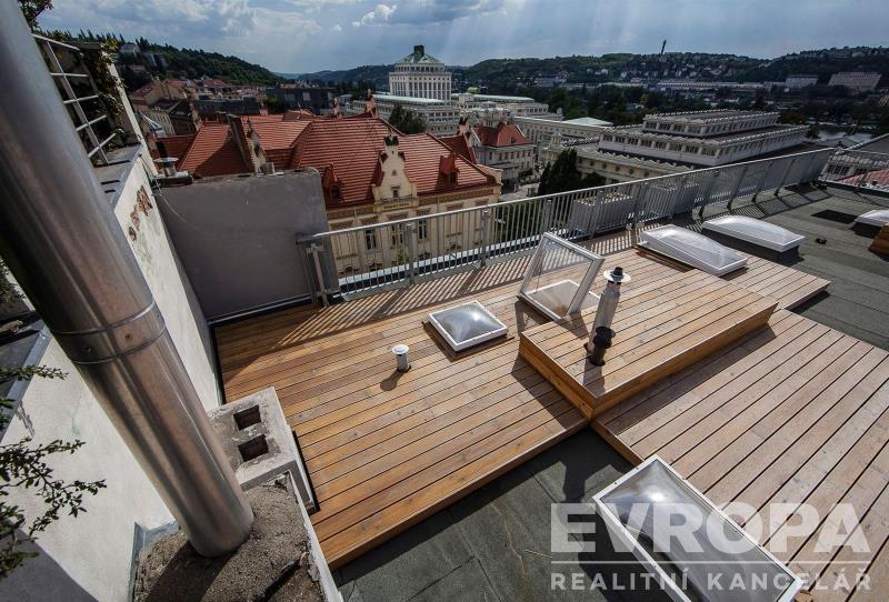 Nabízíme k pronájmu kompletně zařízený podkrovní mezonetový byt 2+kk o rozloze 105 m 2, situovaného v 56 N.P. v činžovním domě s výtahem v klidné ulici v Podolí se střešní terasou s výhledem na Prahu. Byt je prostorný, světlý, orientovaný na jižní stranu. Výhodná lokalita s plnou občanskou vybaveností v blízkém okolí, v pěším dosahu MHD s dobrou dostupností na stanice metra a nábřeží Vltavy. V těsné blízkosti bytu je památka Vyšehrad s parkem. Nedaleko je bazén a koupaliště Podolí a Žluté lázně. Podél Vltavy vede oblíbená cyklostezka. Byt má ve spodní úrovni halu, obývací pokoj se vstupem na terasu, plně vybavenou kuchyňskou linku, koupelnu s vanou a toaletou. V patře je hala s výstupem na střešní terasu s nádherným výhledem na Vyšehrad, ložnice, a plně vybavená koupelna se sprchovým koutem a toaletou. Byt se pronajímá kompletně zařízený, včetně nábytku a všech spotřebičů. Ve vnitrobloku domu je možnost parkování, které je v ceně nájmu. Měsíční částka pro platbu nájmu je 48.000,Kč. K dispozici ihned. Kauce jeden měsíční nájem 40.000,Kč. Pro více informací kontaktujte realitního makléře. Neplatíte provizi RK.