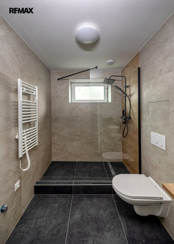 Walk-in sprchový kout, černé armatury, závěsné WC, umyvadlo, žebříkový radiátor. Obklady v imitaci kamene, tmavá dlažba.