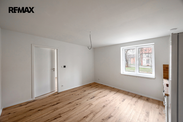 Velké okno, přirozené denní světlo, plně vybavená kuchyňská linka (varná deska, trouba, digestoř, dřez, lednice). Vinylová podlaha v dekoru přírodního dřeva.