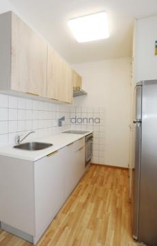 Nabízíme pronájem bytu 2+kk, o ploše 45m2, Praha 9 - Vinoř, Uherská ulice. Byt se nachází ve 4. patře dobře udržovaného domu bez výtahu. Sestává ze vstupní předsíně ve které je umístěna vestavěná skříň a dřevěný předsíňový nábytek, dále je zde jedna samostatná ložnice, obývací pokoj a kuchyňský kout, který je vybavený novou kuchy%ňskou linkou, lednicí s mrazákem a elektrickým sporákem. V bytě je položena nová krytina na podlaze. Dohromady je koupelna se sprchovým koutem a wc, v koupelně je umístěna pračka. V případě potřeby je možné dodat základní nádobí. K bytu náleží sklep umístěný v suterén domu. Je možné užívat společnou kočárkárnu a sušárnu. Ve Vinoři je veškerá občanská vybavenost - pošta, obchody, lékaři, škola. Spojení autobusy na metro Letňany 10min jízdy a na metro Černý Most - 20min jízdy. Byt je vhodný pro dvě osoby. Cena pronájmu 18.500,-Kč + poplatky 3000,-Kč + elektřina, kauce 1 nájem, + provize pro rk.