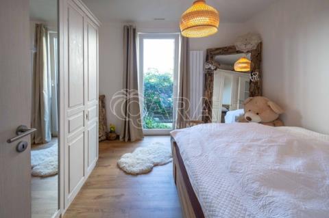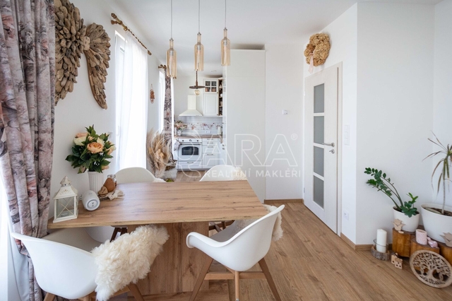 Dispozice bytu v přízemí zdařilé novostavby z roku 2021: vstupní chodba s vestavěnou skříní, ložnice, obývací pokoj s kuchyňským koutem a vstupem na terasu, koupelna s vanou a WC. Z vybavení na fotografiích zůstane jen část: kuchyňská linka včetně spotřebičů (indukční deska, el. trouba, vestavěná lednice s mrazákem, digestoř), dále zůstane šatní skříň v ložnici, gauč a sezení na terase.
