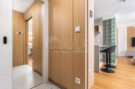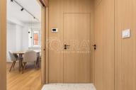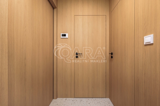 V celém bytě jsou bezfalcové interiérové dveře na míru s magnetickými zámky, sladěné s ostatními dřevěnými prvky. Osvětlení dodalo značkové studio – světla jsou stmívatelná s různými režimy. Podlahy jsou vinylové, v předsíni, koupelně a na WC je dlažba.