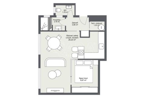V koupelně je prostorný sprchový kout s dešťovou sprchou, zrcadlo s LED osvětlením a koupelnový nábytek. Samostatné WC navazuje na design koupelny a je doplněno o luxfery a hygienickou spršku. K dispozici je také technická místnost s vývodem na pračku a dalším úložným prostorem (pračka není součástí vybavení).