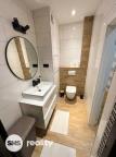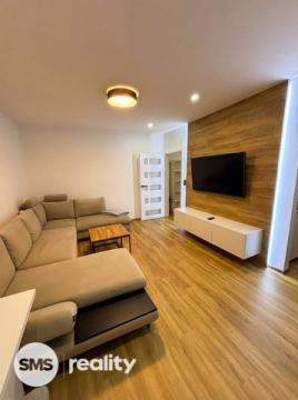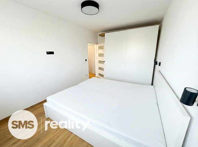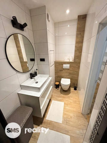 Dispozice bytu je velmi praktická a zahrnuje vstupní chodbu, samostatnou ložnici, obývací pokoj s kuchyňským koutem a koupelnu s toaletou. Obývací část je vybavena prostornou sedací soupravou, konferenčními stolky a TV skříňkou, což vytváří příjemný prostor pro relaxaci i návštěvy. Kuchyňský kout je součástí obývacího pokoje a poskytuje dostatek místa pro každodenní vaření a stolování. Ložnice je zařízena manželskou postelí, nočními stolky a úložnými prostory. Koupelna je moderně řešena se sprchovým koutem, umyvadlem se skříňkou a toaletou, vše v elegantní kombinaci bílé barvy a dřeva.