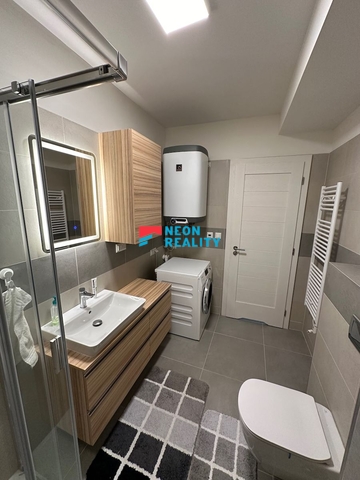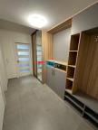 V koupelně, která je spojená s toaletou se nachází velký sprchový kout, pračka se sušičkou opět Miele, a elektrický kotel. Na chodbě jsou je prostor dokonale využitý vestavnými skříněmi a botníkem.