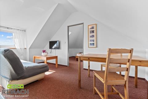 Byt o dispozici 2+kk s velkou vstupní chodbou a úložným prostorem se nachází v posledním patře domu, který se nachází jen kousek od samotného centra Uherského Hradiště a dále s výbornou dostupností na vlakové nádraží. K bytu je možno si pronajmout i venkovní vyhrazené parkovací místo. Ze vstupní chodby je vstup do koupelny se sprchovým koutem, toaletou a je zde také připojení na pračku (není součástí). Obývací pokoj je vybaven novou kuchyňskou linkou se spotřebiči, lednicí, sedací soupravou, jídelním stolem a židlemi, konferenčním stolkem, TV stolkem a televizí. V ložnici je manželská postel dva noční stolky a dva konferenční stolky. Do tohoto bytu si stačí jen přinést své osobní věci a můžete hned bydlet, bez nutnosti dalších investic.