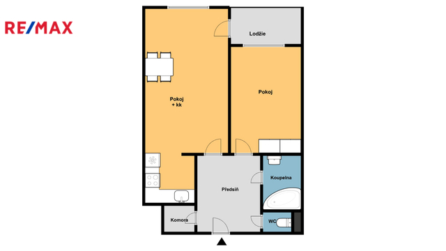 Dispozice zahrnuje předsíň s návazností na praktickou komoru, samostatné WC a koupelnu s rohovou vanou, která nabízí příjemné místo pro večerní relax. Obývací pokoj plynule navazuje na kuchyňský kout s dostatkem pracovní plochy i úložného prostoru. Ložnice poskytuje klidné zázemí pro odpočinek a díky vestavěné skříni také dostatek místa pro uskladnění věcí.
