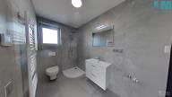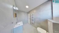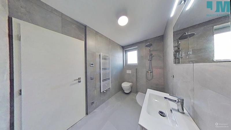 Koupelna je provedena v nadčasovém designu s velkoformátovými obklady, nabízí dostatek prostoru, moderní umyvadlovou skříňku, WC a praktický topný žebřík.