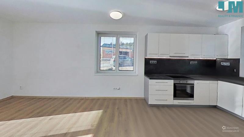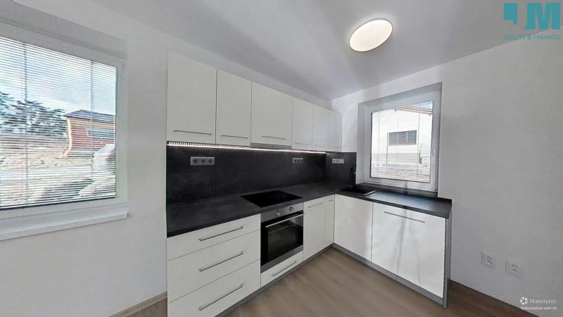 Byt je navržen s důrazem na praktičnost, komfort a moderní styl. Dominantou obytného prostoru je kuchyňská linka do tvaru L v elegantním bílém provedení s tmavou pracovní deskou. Kuchyně je plně vybavena kvalitními spotřebiči: granitový dřez, indukční varná deska, elektrická trouba, digestoř a myčka nádobí.