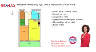 Byt o celkové podlahové ploše 56 m2 (+ 11 m2 lodžie) se nachází ve třetím nadzemním podlaží zděného domu. Celý byt je orientován na jih, v domě je výtah.