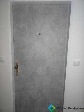 Dveře: Vstupní protipožární Sapeli, vnitřní dveře v imitaci dub Halifax fy SEPOS, křídlové a posuvné se soft-close dovíráním