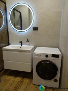 Koupelna: Zděné jádro, rozšířený prostor, sprchový kout 120 × 90 cm, vyhřívané zrcadlo a včetně pračky se sušičkou Beko