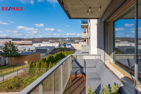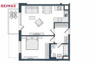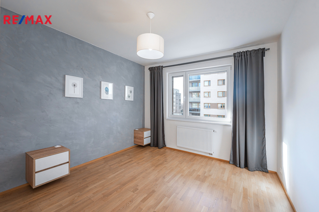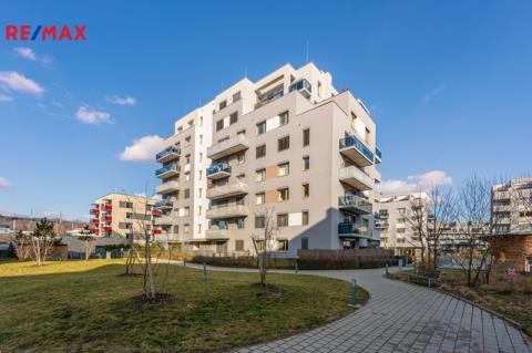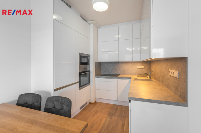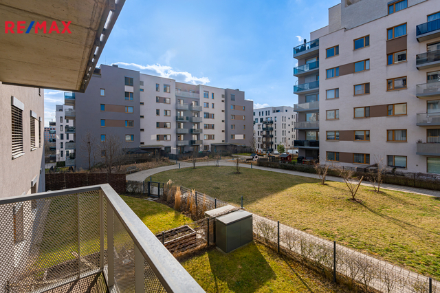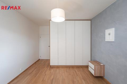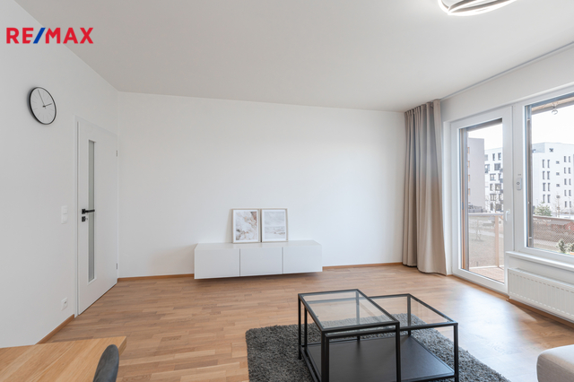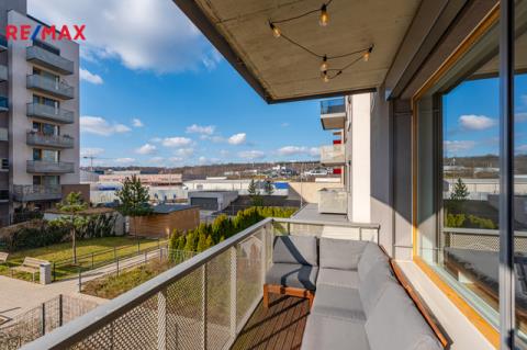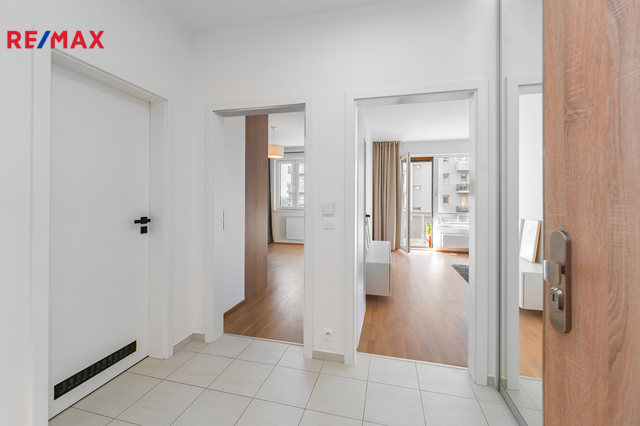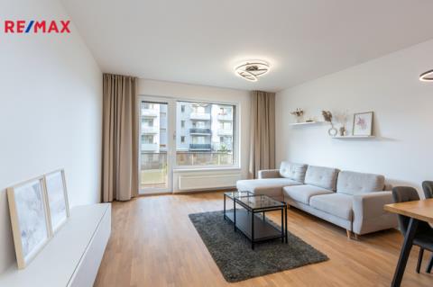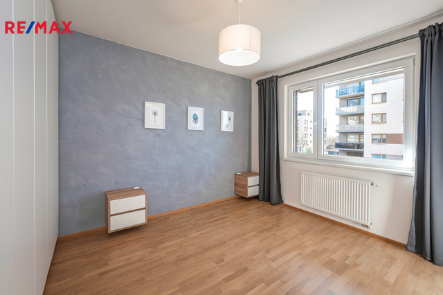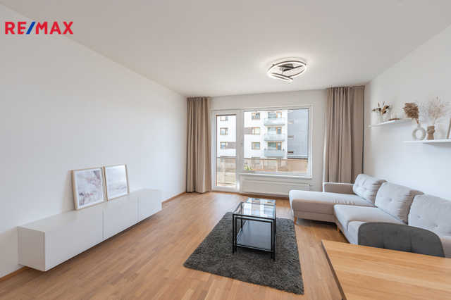 Dominantou bytu je světlý obývací pokoj s kuchyňským koutem a přímým vstupem na balkon. Kuchyň je vestavěná, moderně řešená a plně vybavená spotřebiči (trouba, mikrovlnka, myčka, indukční deska, digestoř). Ložnice nabízí dostatek úložného prostoru rovněž díky vestavěným skříním na míru, stejně jako skříně v předsíni. Samozřejmostí je kvalitní koupelna s nadčasovým designem. Byt je orientován na západ do soukromého a klidného vnitrobloku.