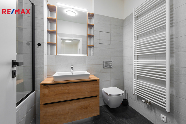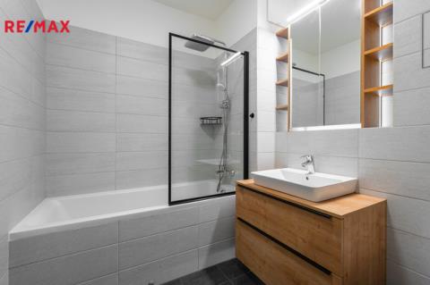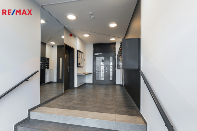 Interiér je laděn v moderním stylu s důrazem na detail – designové osvětlení, vestavěné prvky a předokenní žaluzie zajišťují nejen estetiku, ale i maximální komfort bydlení. Byt působí velmi příjemně, vzdušně a reprezentativně.
