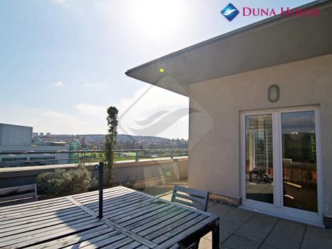 K pronájmu nabízíme prostorný byt s velkorysou terasou o výměře 100 m² v šestém patře bytového domu na Praze 10 s vlastním garážovým stáním.