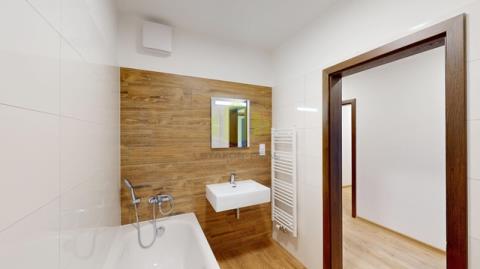 Kuchyňský kout je vybaven kuchyňskou linkou s indukční varnou deskou, elektrickou troubou, myčkou nádobí a samostatně stojící lednicí s mrazákem. V koupelně se nachází vana, umyvadlo, otopný žebřík a příprava pro pračku. Byt se pronajímá nevybavený, s výjimkou kuchyňské linky a spotřebičů.