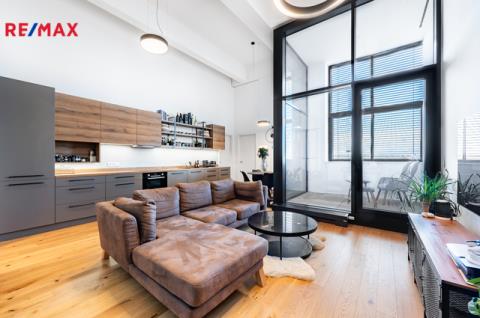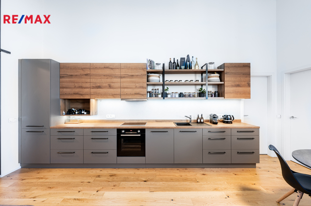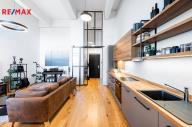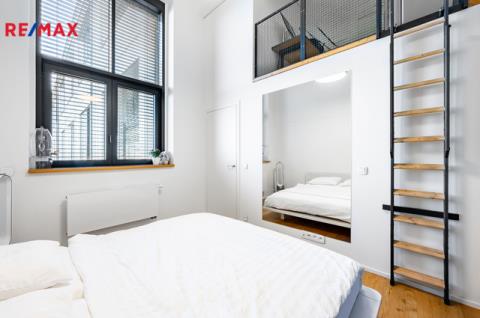 Interiér tvoří světlý obývací pokoj s kuchyňským koutem na míru, vybaveným myčkou, elektrickou troubou a indukční varnou deskou. Z obývací části je vstup na prosklenou lodžii s panoramatickým výhledem na Prahu. Ložnice disponuje vestavěnými skříněmi a vstupem do vyvýšené galerie, kterou lze využít jako šatnu, úložný prostor nebo pracovnu.