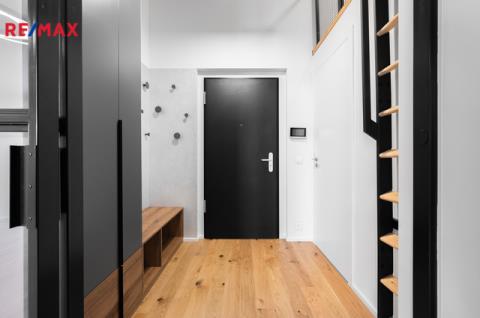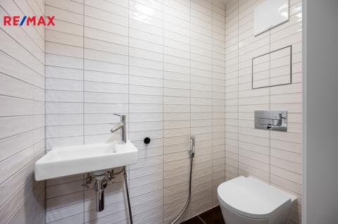 Koupelna je vybavena vanou, pračkou a topným žebříkem. Samostatné WC nabízí bidetovou spršku. Vstupní chodba poskytuje další úložné prostory a přístup do galerie. Orientace bytu je na severovýchod, což zajišťuje příjemné světelné podmínky bez přehřívání interiéru.