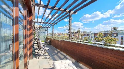 Byt o celkové ploše 76,14 m² (56,18 m² byt + 19,96 m² terasa) se nachází v moderním domě se solárními panely a zaujme světlým vzdušným interiérem s dřevěnou podlahou a příjemnou atmosférou doplněnou zelení.